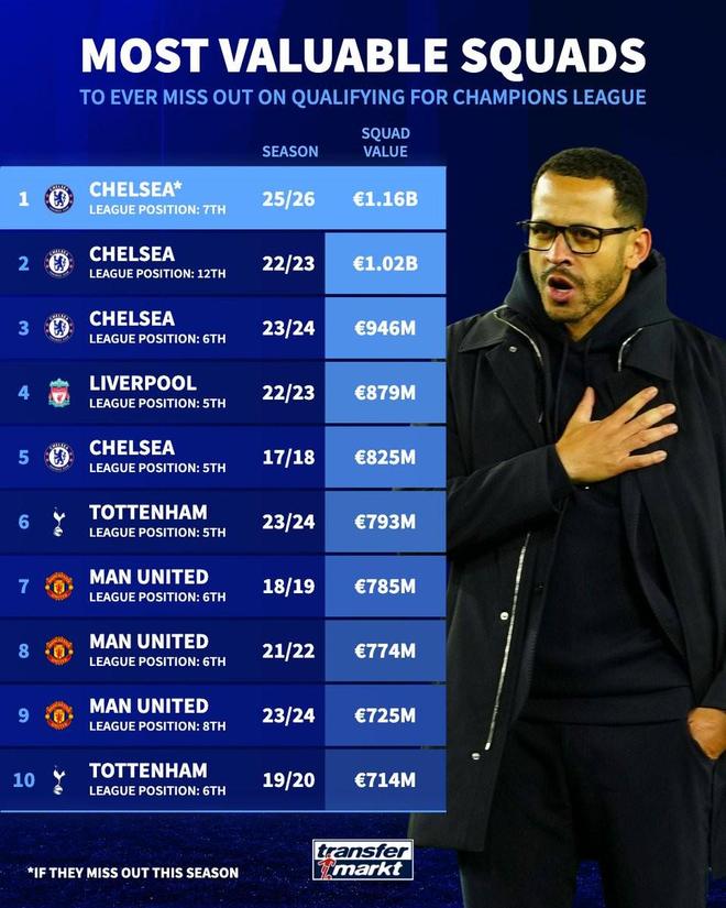 北京时间4月22日,在切尔西遭遇英超5连败且一球未进,排名跌落至积分榜第7位的情况下,根据德转的统计,本赛季的蓝军可能成为有史以来无缘欧冠身价最高的球队,打破他们于2022-23赛季创造的纪录。
