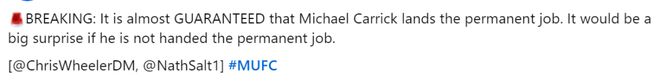 英国《每日邮报》称,曼联估计仍然不会在赛季结束前公布下赛季主帅,他们理论上还没有作出决定。但卡里克几乎肯定(almost GUARANTEED)能获得工作,如果他拿不到转正合同,那才真是令人意外。