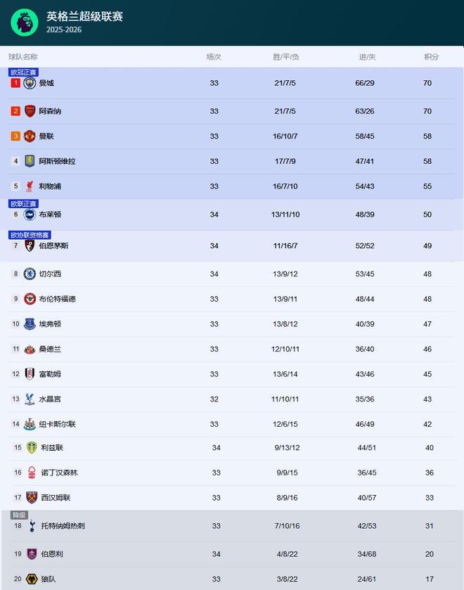 这场胜利也正式改写了英超积分榜的排名。在曼城比赛结束后,英超官方积分榜更新,曼城与阿森纳同积70分,净胜球也完全相同。在比较第三个关键指标——总进球数时,曼城的66球对阿森纳的63球占据了3球的优势。因此,曼城凭借这3个进球的微弱优势,成功反超阿森纳,登上了英超积分榜的榜首。