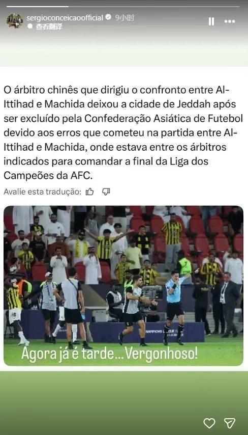 除了球员和球迷,赛后吉达联合主教练在赛后也是怒喷裁判组,在赛后的发布会上,孔塞桑直言不讳的表示,这是一场不公平的比赛,球队的输球完全是因为裁判,吉达联合不应该输,主裁判的表现的很糟糕。同时,他还表示,裁判才是比赛中球队的真正对手,而不是日本球队,吉达联合多次占据优势,但裁判阻挠了他们。并且在社交媒体上,他还晒出了马宁被处罚的消息,并配文“为时已晚,丢人!”