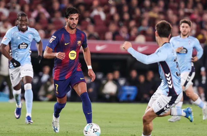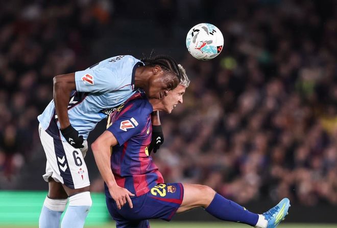 第23分钟,坎塞洛受伤下场,阿莱士-巴尔德替补上场。6分钟后,亚马尔在禁区外外脚背兜射,皮球稍稍偏出右侧立柱。第38分钟,亚马尔在右侧起球传中。奥尔莫头球攻门,顶偏了。紧接着,亚马尔在禁区带球突破被放倒。裁判判罚点球。亚马尔亲自主罚,他稳稳罚进,帮助巴萨取得领先。但他也因此受伤了,不得不被换下。半场结束,巴萨1-0领先塞尔塔。