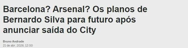 ESPN巴西站消息,贝尔纳多-席尔瓦将在今夏成为自由身,而阿森纳令人惊讶的成为了曼城球星的追求者,巴萨则同样正在密切关注这名老将的情况。
